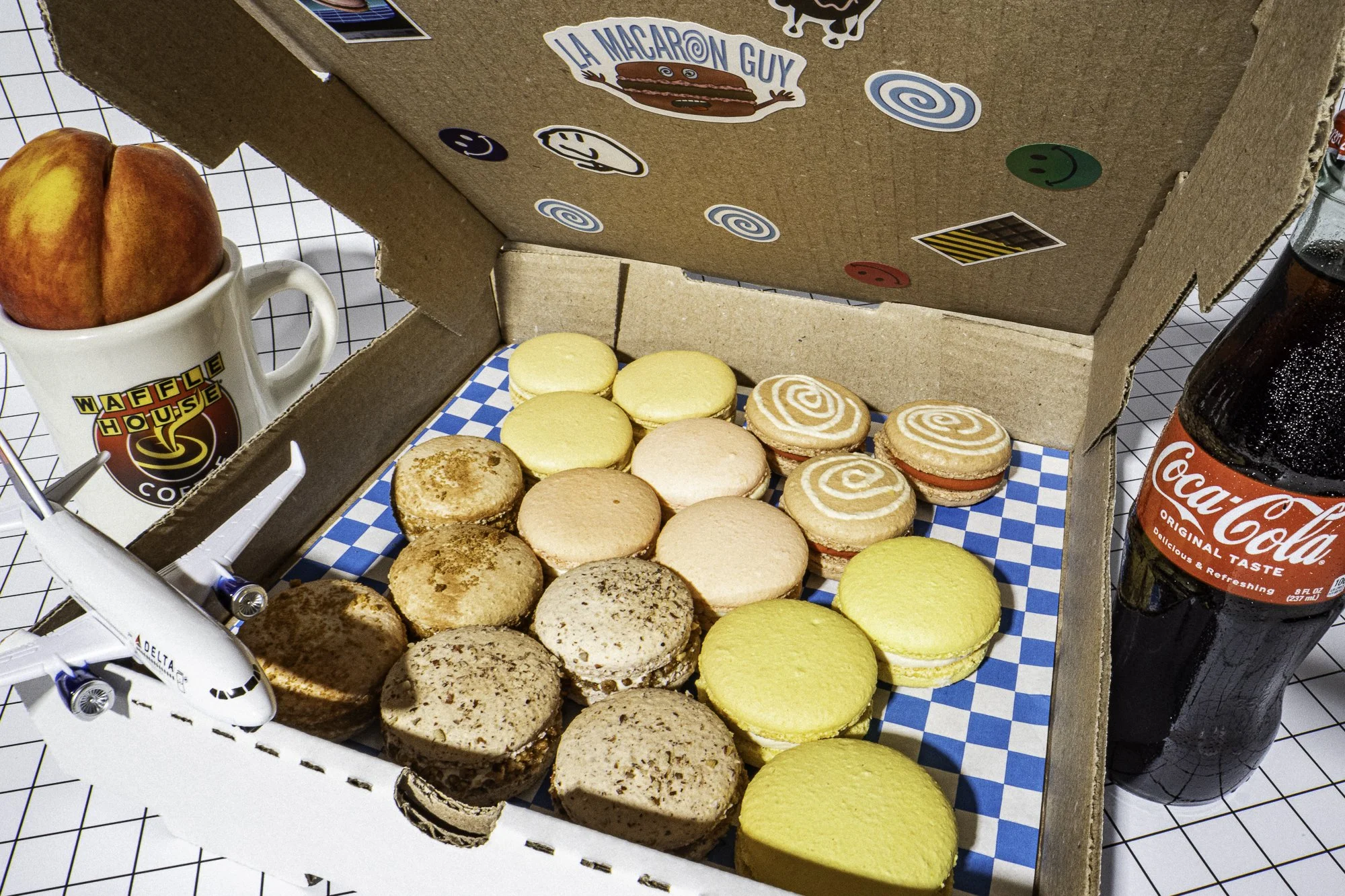 Inspired by Waffle House: a traditional macaron shell filled with a buttery maple cream. Like waffles in a cookie form.