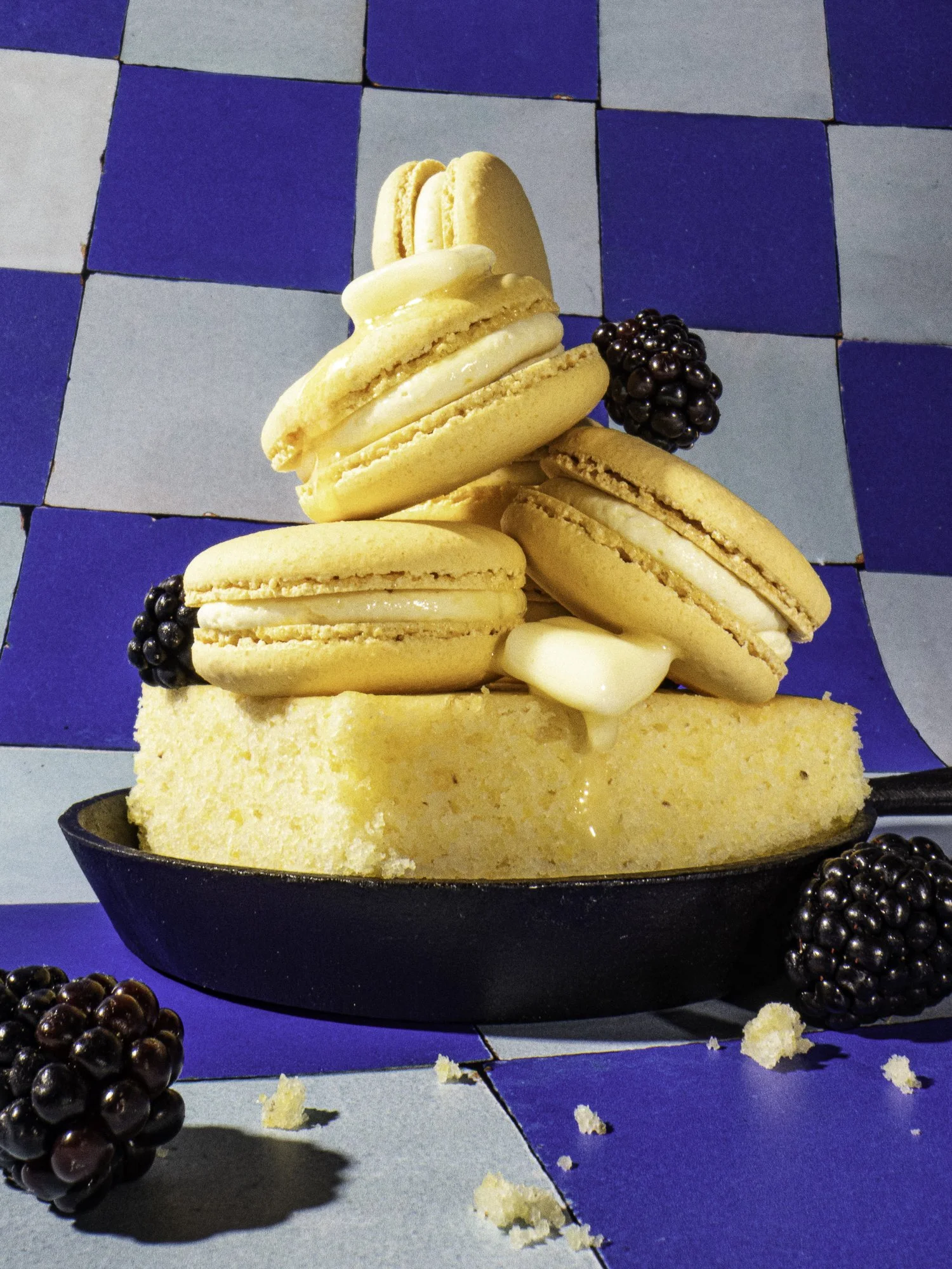 Cornmeal macaron shell, corn buttercream and a blackberry jam in the center.