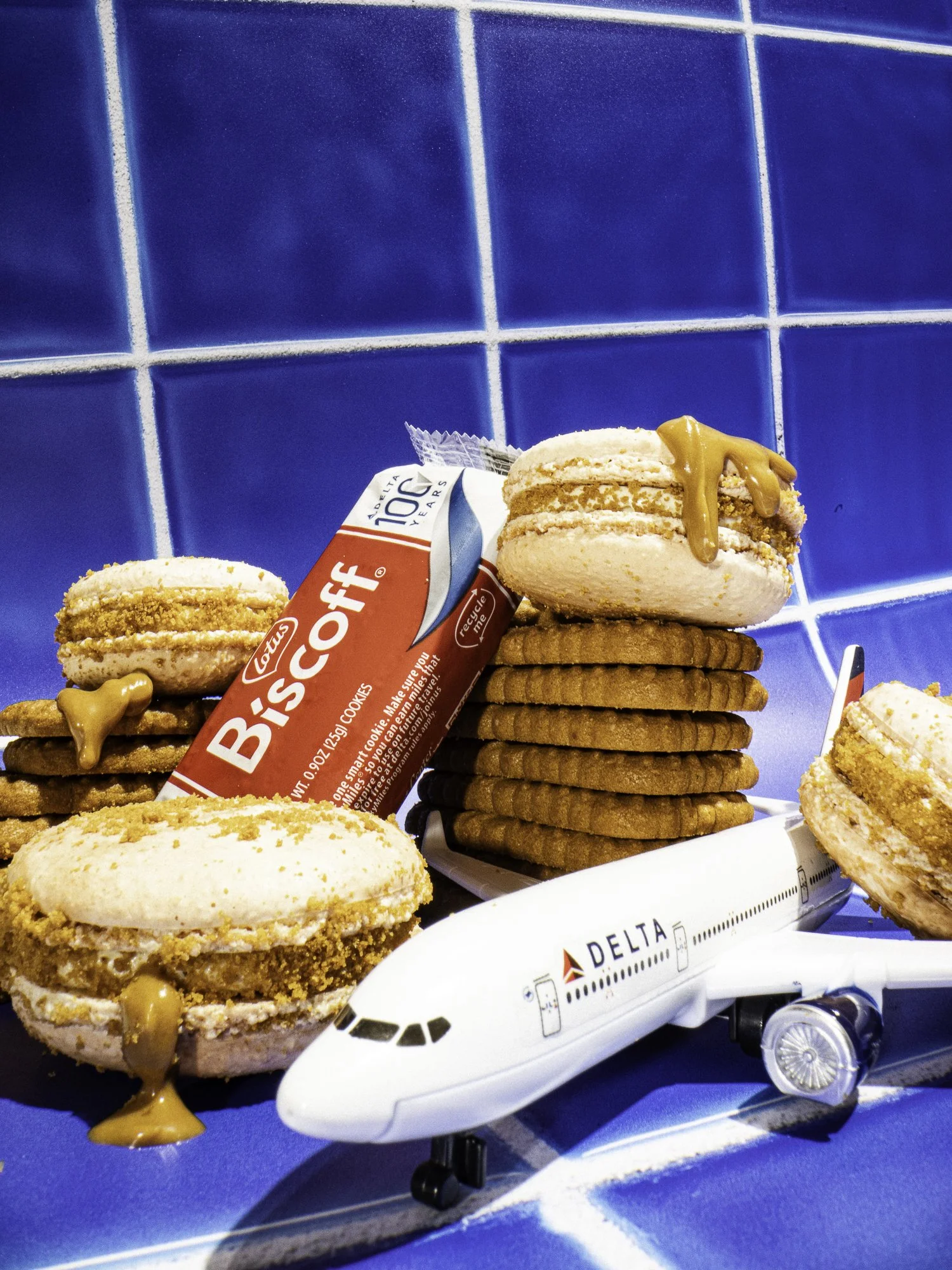 Traditional macaron shell with cookie crumbles baked on top, Biscoff buttercream, and a cookie butter center - all rolled in crumbled Biscoff cookies.